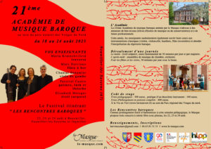 Parallèlement à cette Académie, le Festival itinérant ” Les Rencontres Baroques ” aura lieu les 22, 23 et 24 août.