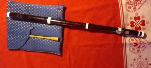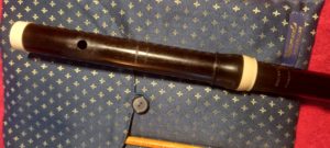En grenadille et ivoire véritable. Embouchure ronde (période baroque). Pied de registre réglable.