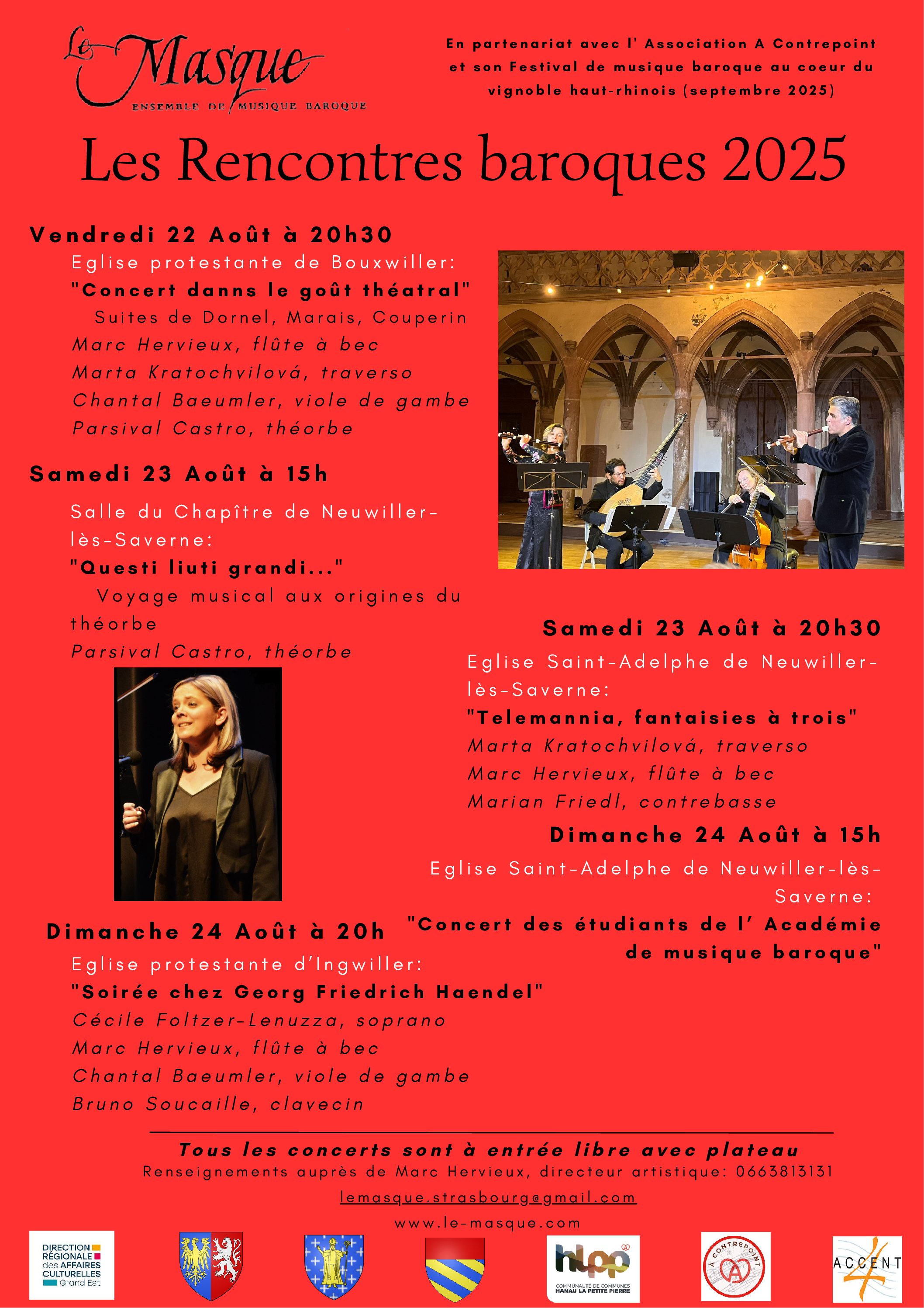 Festival itinérant ” Les Rencontres baroques ” Vendredi 22 août à 20h30 église protestante de Bouxwiller ” Concert dans le goût théâtral “, Suites de Marais, Couperin, Dornel Marc Hervieux, flûte à bec Marta Kratochvilová,...