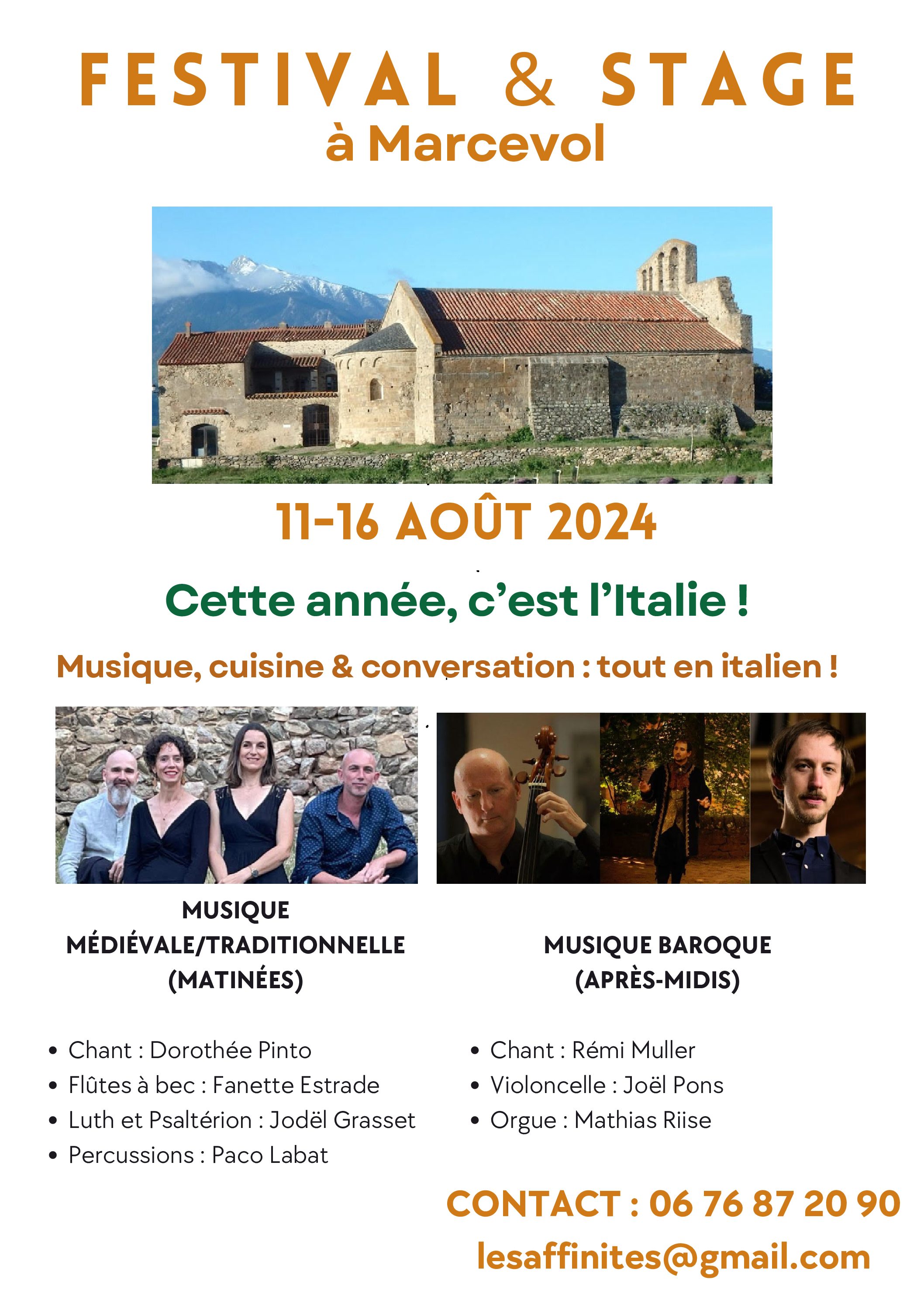 Festival et Stage de Musique ancienne 3ème édition au prieuré de Marcevol 11 au 16 Août 2024 Thématique : musiques italiennes (Ars nova, traditionnelles et baroques) Cuisine préparée par un chef italien Forfaits de...