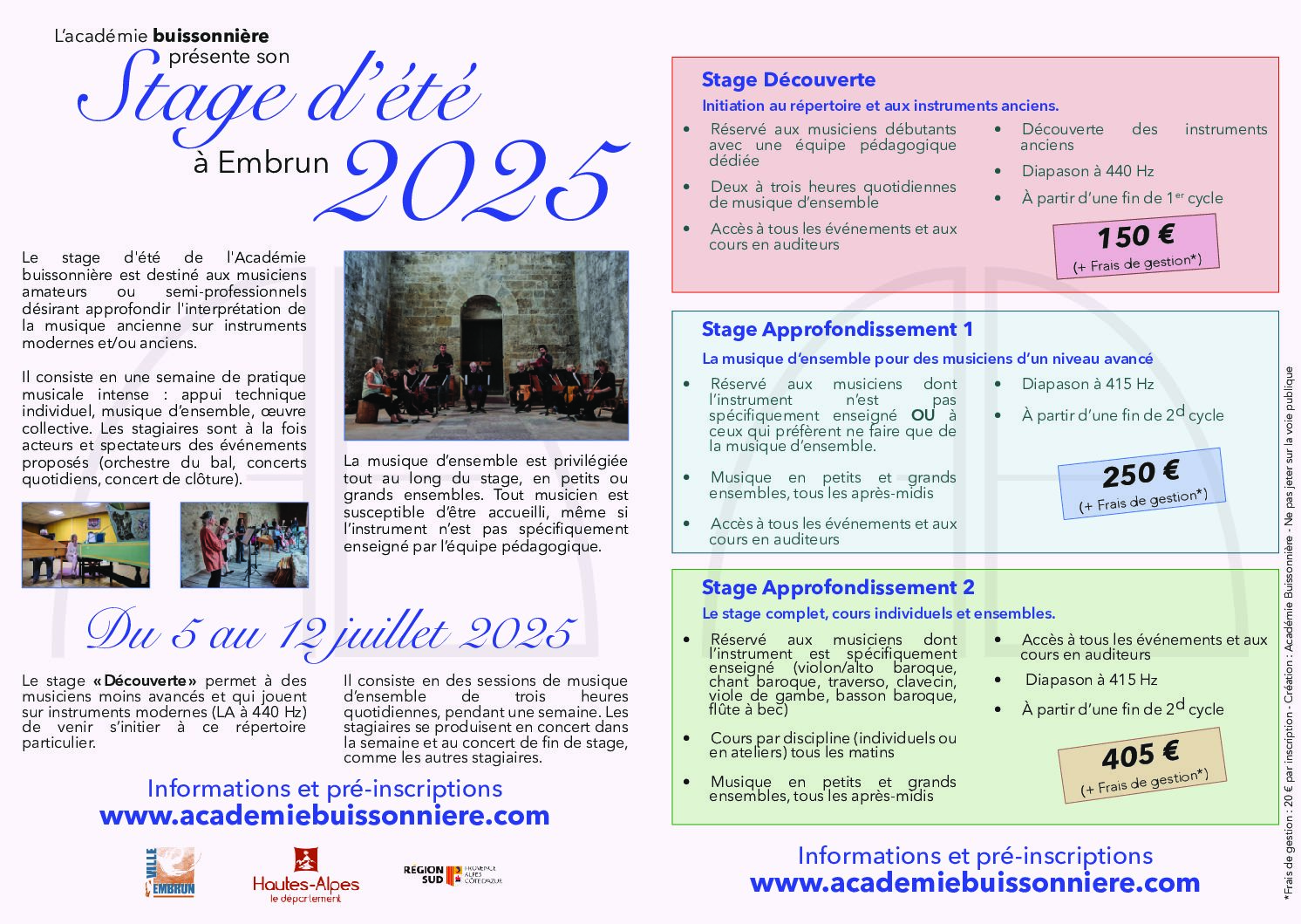 Le stage d’été de musique ancienne de l’Académie buissonnière aura lieu du samedi 5 juillet au samedi 12 juillet 2025 à Embrun, dans les Hautes-Alpes. Les journées sont partagées entre les cours dans la...