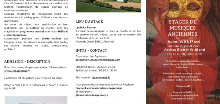 Sessions A et B – 28/07 au 3/08 et 4/08 au 10/08 Vous recherchez un stage d’été de flûte à bec, vous initier ou vous spécialiser en improvisation générative et Soundpainting pluridisciplinaire ? Un...
