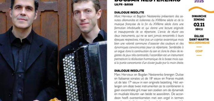 Dialogue insolite Marc Hervieux, flûte à bec Bogdan Nesterenko, accordéon Dimanche 2 novembre 16h église St Martin de Wulverdinghe Festival Orgues en Flandre Marc Hervieux et Bogdan Nesterenko présentent des sonates allemandes et italiennes...