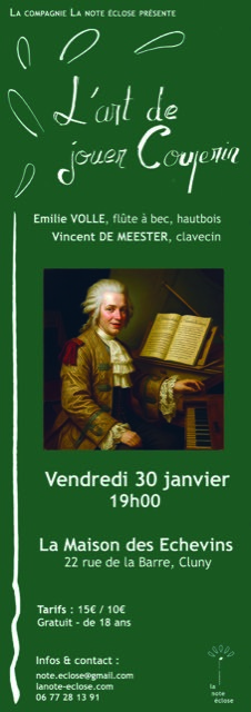 Concert à Cluny (71) le 30 janvier par Flûtes à bec en France · 27 janvier 2026 Concert L’Art de jouer Couperin Vendredi 30 janvier, 19h Maison des Echevins à Cluny (71) Emilie Volle, flûtes à bec & hautbois Vincent de Meester, Clavecin Partager