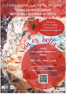 Concert « La vie es bella », 25 octobre, Arles (13) par Flûtes à bec en France · 9 octobre 2025 Emilie Volle (flûte à bec) en concert Le samedi 25 octobre à 20h30. Chapelle Sainte Anne à Arles Consultez l’affiche pour plus d’informations : Partager