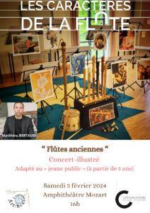 Concert Matthieu Bertaud – Avignon – 03/02 par Flûtes à bec en France · 1 février 2024 “Les Caractères de la flûte » Concert-illustré par Matthieu Bertaud Samedi 3 février – 16h00 Conservatoire à Rayonnement Régional d’Avignon Amphithéâtre Mozart – Entrée libre Partager
