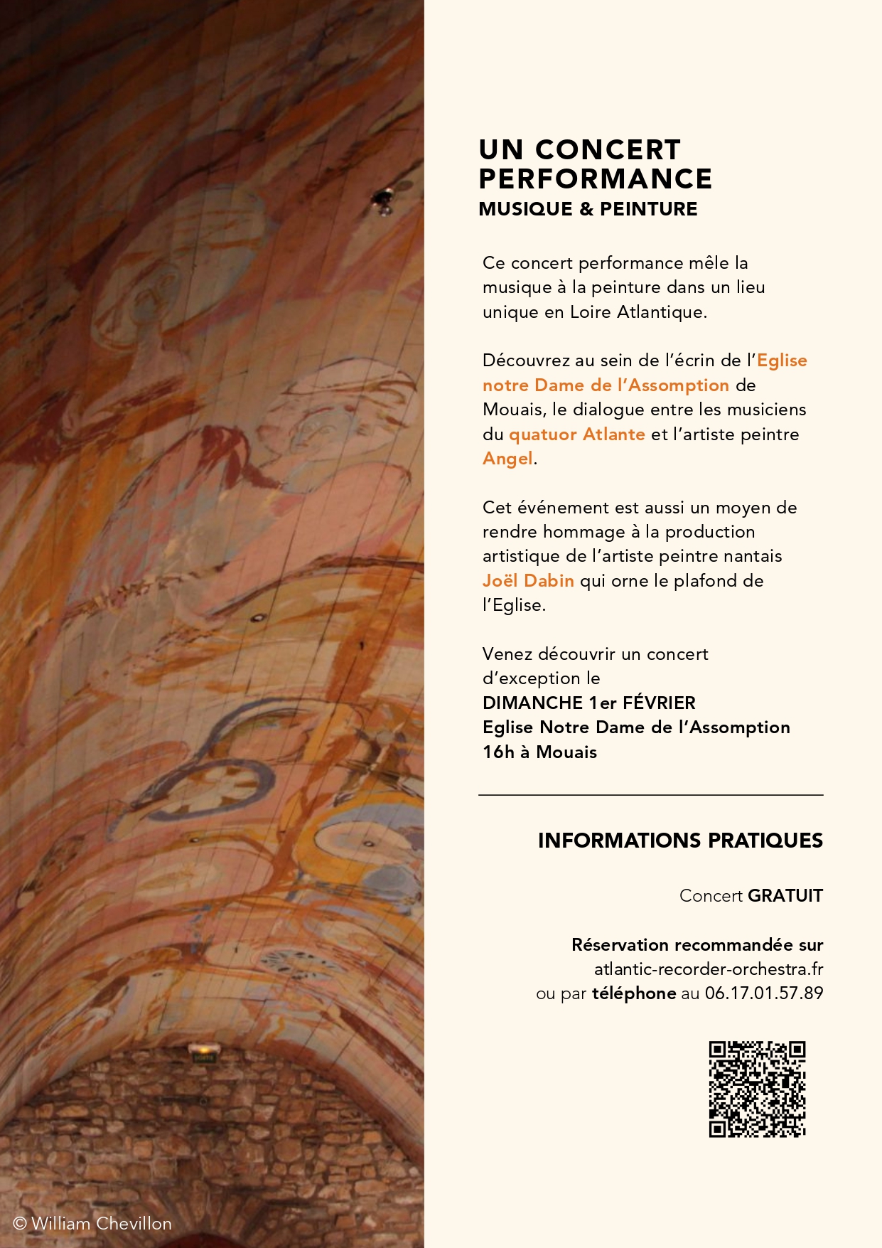 Découvrez au sein de l’écrin de l’Eglise-Notre-Dame-de-l’Assomption de Mouais, le dialogue entre les musiciens du quatuor Atlante et l’artiste peintre Angel.