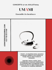 Synopsis: « Umami », la cinquième saveur, savoureux en japonais, désigne ici une invitation au voyage, dans un Japon musical et intemporel. Légendes, folklore, mythes, rêves contemporains et chansons traditionnelles se confondent dans ce programme conçu comme une ode à un Japon onirique peuplé de divinités et comptines millénaires. C’est par la musique des compositeurs japonais du XXe et XXIe siècle que L’Ensemble Les Incidences invite à une découverte du consort de flûte à bec ainsi qu’à l’une des facettes de son vaste répertoire.