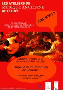 Concerts des Ateliers de Musique Ancienne de Cluny : 7 et 9 juin par Flûtes à bec en France · 29 mai 2025 Une après-midi avec les Consorts de viole de gambe et de flûtes à bec : Samedi 7 juin à l’Hôtel Dieu de Tournus. Deuxième rendez-vous: le 9 juin à l’Eglise St Marcel de Cluny à 17h : Extraits de la Rappresentatione di Anima et di Corpo Partager
