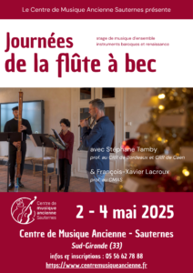 Simultanément aux Journées de la Viole, se dérouleront les 2èmes Journées de là flûte à bec. Les journées se baseront sur le répertoire de Consort de flûtes à bec, tant Renaissance que Baroque, en regroupant des flûtistes jouant sur de nombreuses flûtes et parfois s’essayant à des flûtes rares de Consort, comme la sopranino ou la contrebasse en fa. Il y a également la possibilité de monter des pièces en plus petit effectif et/ou avec continuo. Des cours individuels et en petits groupes seront également possibles en option. C’est l’occasion d’approfondir un répertoire avec 2 professeurs très engagés dans l’enseignement de la flûte à bec et également concertistes. Un partage avec les Journées de la viole de gambe aura également lieu. Ces Journées de la flûte à bec auront lieu au Centre de Musique Ancienne Sauternes et dans le village de Sauternes.