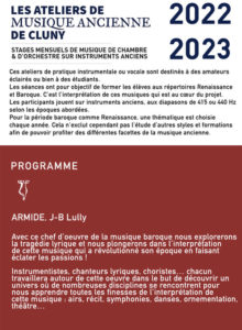C’est bientôt la rentrée des Ateliers de musique ancienne de Cluny (71). Les inscriptions sont ouvertes. C’est ARMIDE de Lully qui guidera cette année. Un dimanche par mois pour vous plonger dans le monde fabuleux du baroque français et travailler en ensemble.