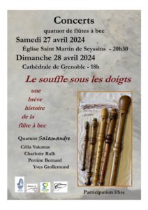 Un concert sera donné le 27 Avril 2024 à 20.30 par le quatuor Salamandre, ensemble de flûtes à bec qui souhaite faire redécouvrir ces instruments apparemment connus, mais plutôt méconnus ! Les quatre musiciens que le composent, tous professionnels viennent de Provence, Corse et Grenoble, et se retrouvent autour d’une passion pour le son et les possibilités expressives de ces instruments dans des répertoires aussi variés que du XVI° au XXI°s.