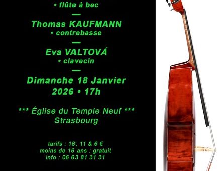 « Conversations à trois avec Johann Sebastian Bach » dimanche 18 janvier 2026 à 17h à l’ église du Temple Neuf à Strasbourg Marc Hervieux, flûte à bec Thomas Kaufmann, contrebasse Eva Valtova, clavecin...