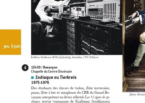 Concert le jeudi 5 juin à 12h30, chapelle du Centre Diocesain, 20 rue Mégevand, 25000 Besançon Tierkreis de Karlheinz Stockhausen, notamment avec la participation des élèves des classes de flûte à bec, flûte traversière, violon,...